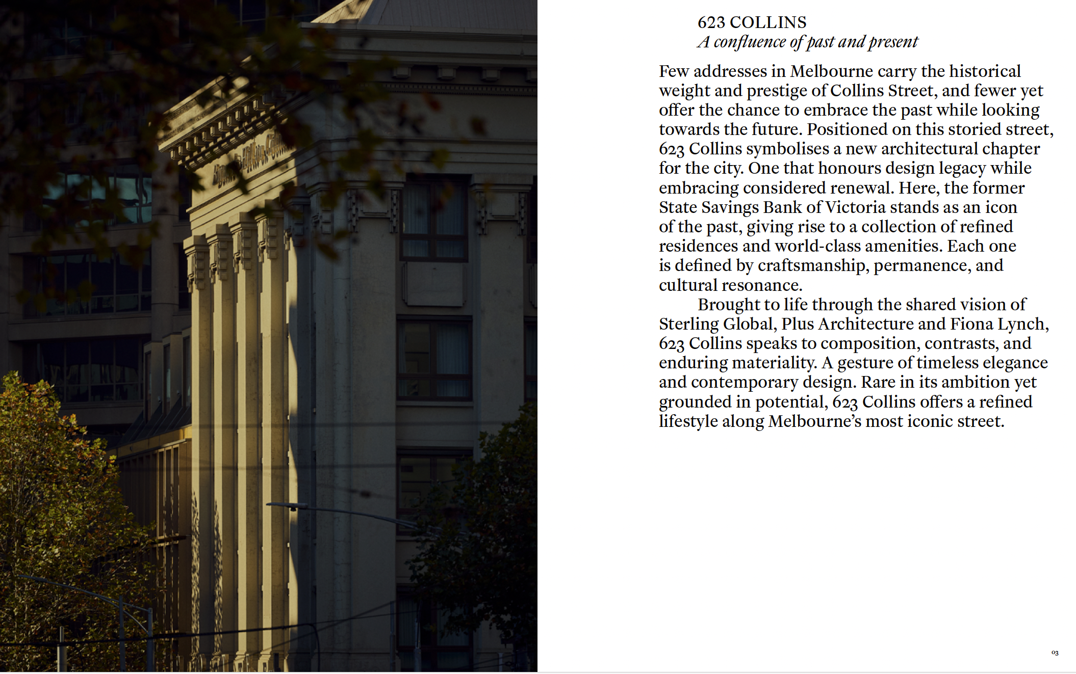 The copy establishes the project as a conversation between past and future: honouring the heritage of the State Savings Bank while celebrating the architectural vision of Plus Studio and Fiona Lynch. Most importantly, the language creates space for buyers to understand what living here truly means – inhabiting quiet luxury at an address steeped in history, becoming part of a story that's continuing to unfold, and securing a place in the city's next chapter.