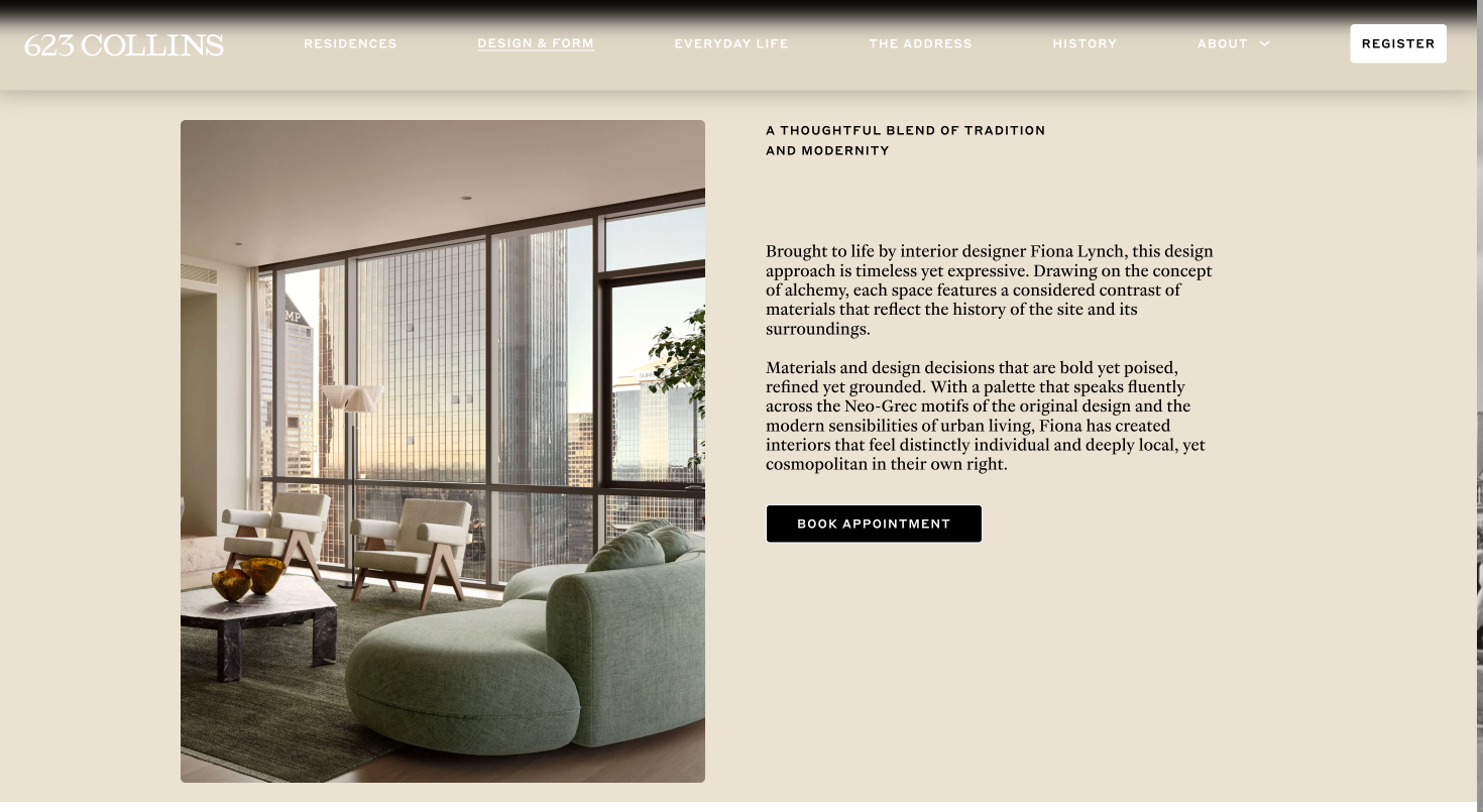 Website Copy: This editorial approach was extended to the website copy, inviting visitors into a dialogue with the past while exploring what's still to come. From homepage storytelling to considered sections on Design & Form, Everyday Life, The Address, and History, every page balances sophistication with accessibility. The language mirrors the development's ethos: timeless elegance meeting contemporary innovation, classic design elements reimagined with cultural nuance.
